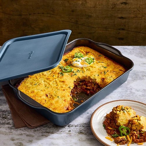 Der hochwertige aluminisierte Stahl sorgt für gleichmäßige Bräunung, während die hervorragende Antihaftbeschichtung ein einfaches Lösen deiner Speisen ermöglicht. Dank des passenden Deckels lassen sich Reste direkt in der Form aufbewahren – ideal für den nächsten Tag oder dein Meal-Prep für die Woche.