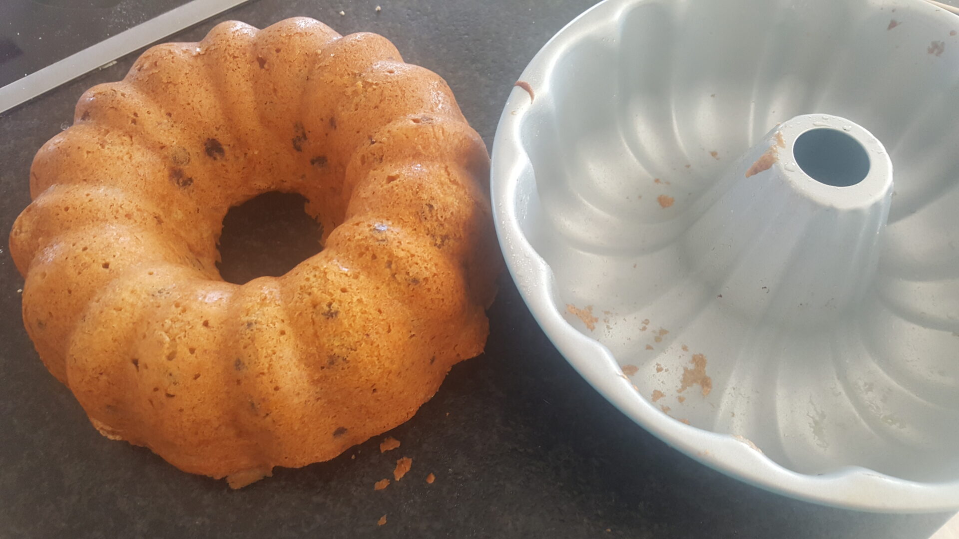 - Zum Herausnehmen des Kuchens, stülpen Sie die Form auf ein Tablett oder Kuchengitter und klopfen vorsichtig auf die Form. Falls der Kuchen klebt, mit einem Lösespatel entlang der Seite und um das Mittelteil herum fahren. Tipp: Das Umstülpen des Kuchens während er noch warm ist, verringert die Dombildung und lässt den Kuchen eben auf dem Tablett ruhen.