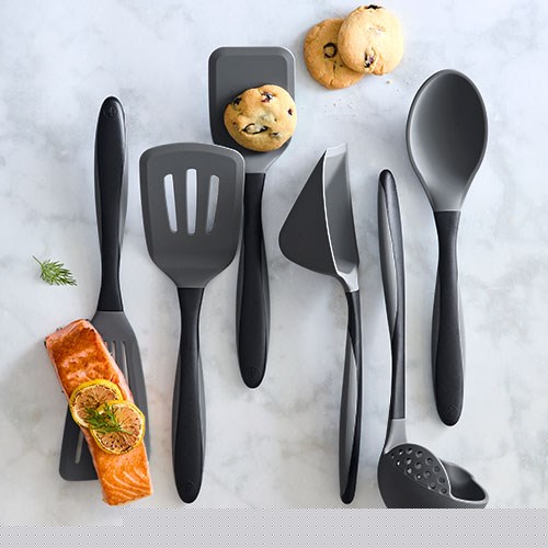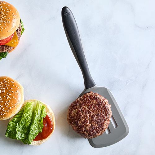 Der Edelstahl-Kern sorgt für Flexibilität und die abgeschrägten Kanten lassen dich unter das Essen gleiten. Die Helfer in edlem schwarz-grauen Design haben einen ergonomischen Soft-Touch-Griff für eine angenehme Anwendung.