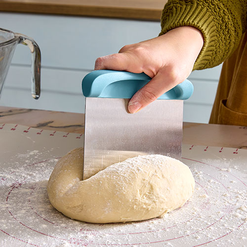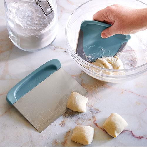 Der Teigschneider eignet sich auch perfekt, um gehackte Zutaten wie Zwiebeln, Kräuter oder Gemüse aufzunehmen und direkt in eine Schüssel oder Pfanne zu geben. Würdest du dafür ein Messer verwenden, kann dessen Klinge schnell stumpf werden. Die stabile Edelstahlklinge des Teigschneiders ist zudem ideal, um angetrocknete Teigreste oder andere Rückstände von der Arbeitsfläche zu entfernen.
