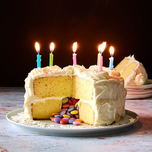 Verstecke tolle Überraschungen in deinen Kuchen! Fülle sie mit Schokolinsen oder anderen Süßigkeiten, so dass beim Anschneiden die geheime Füllung zum Vorschein kommt. Du kannst deinen Kuchen auf zwei verschiedene Arten eine lustige Überraschung hinzufügen – in der Mitte des ganzen Kuchens oder in jedem einzelnen Stück!