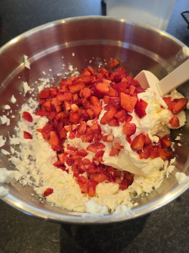 Erdbeeren und Sahne unterheben, auf den abgekühlten Kuchen streichen
