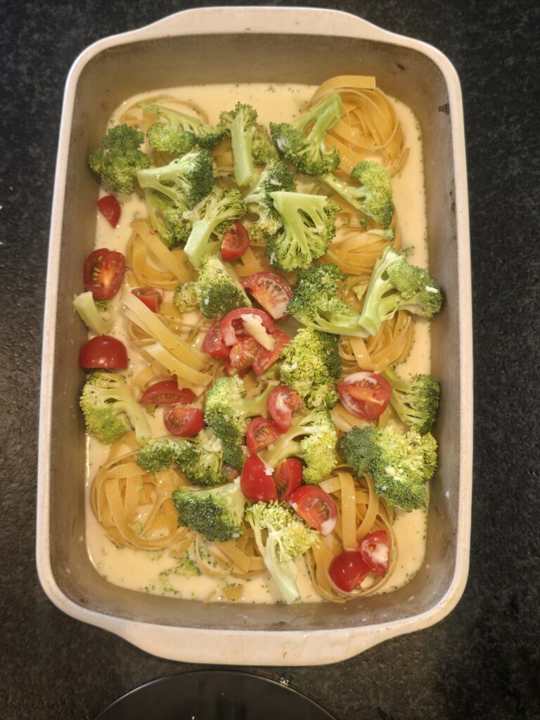 erst Nudeln, dann das Gemüse in die Auflaufform geben
