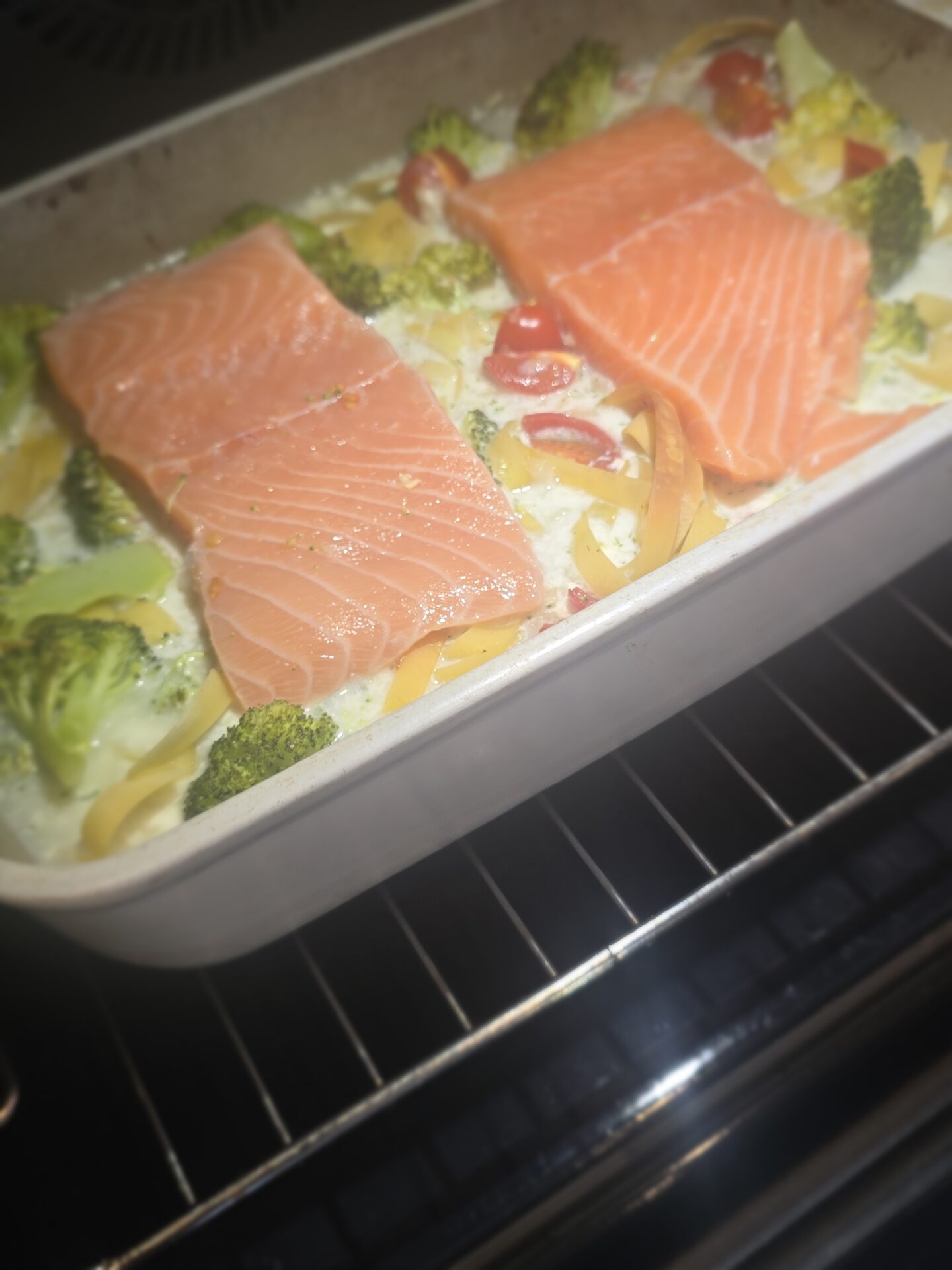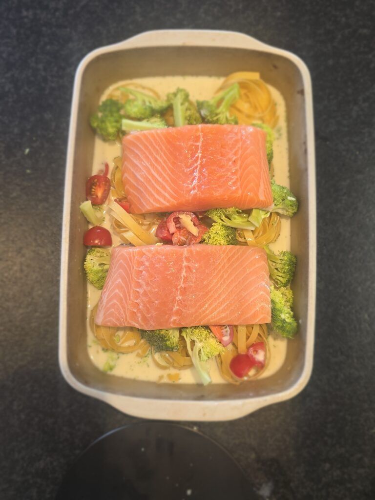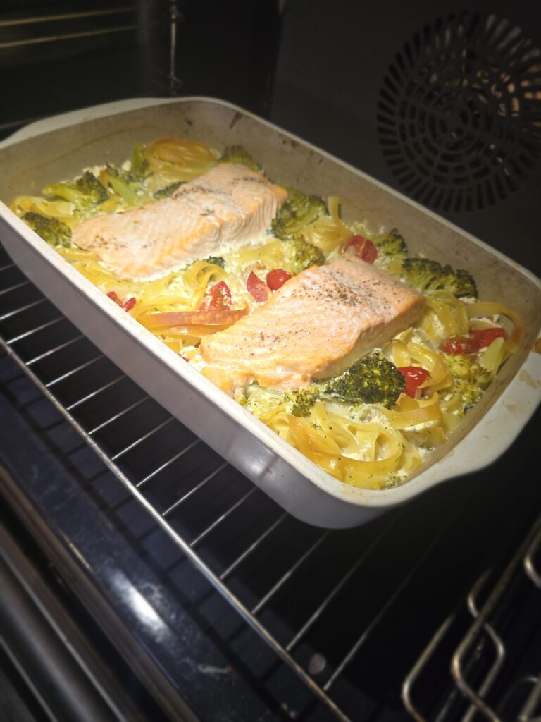 ist der Lachs frisch, dann gebt Ihr Ihn erst bei der Halbzeit dazu, nur TK Lachs die ganze Zeit im Ofen lassen