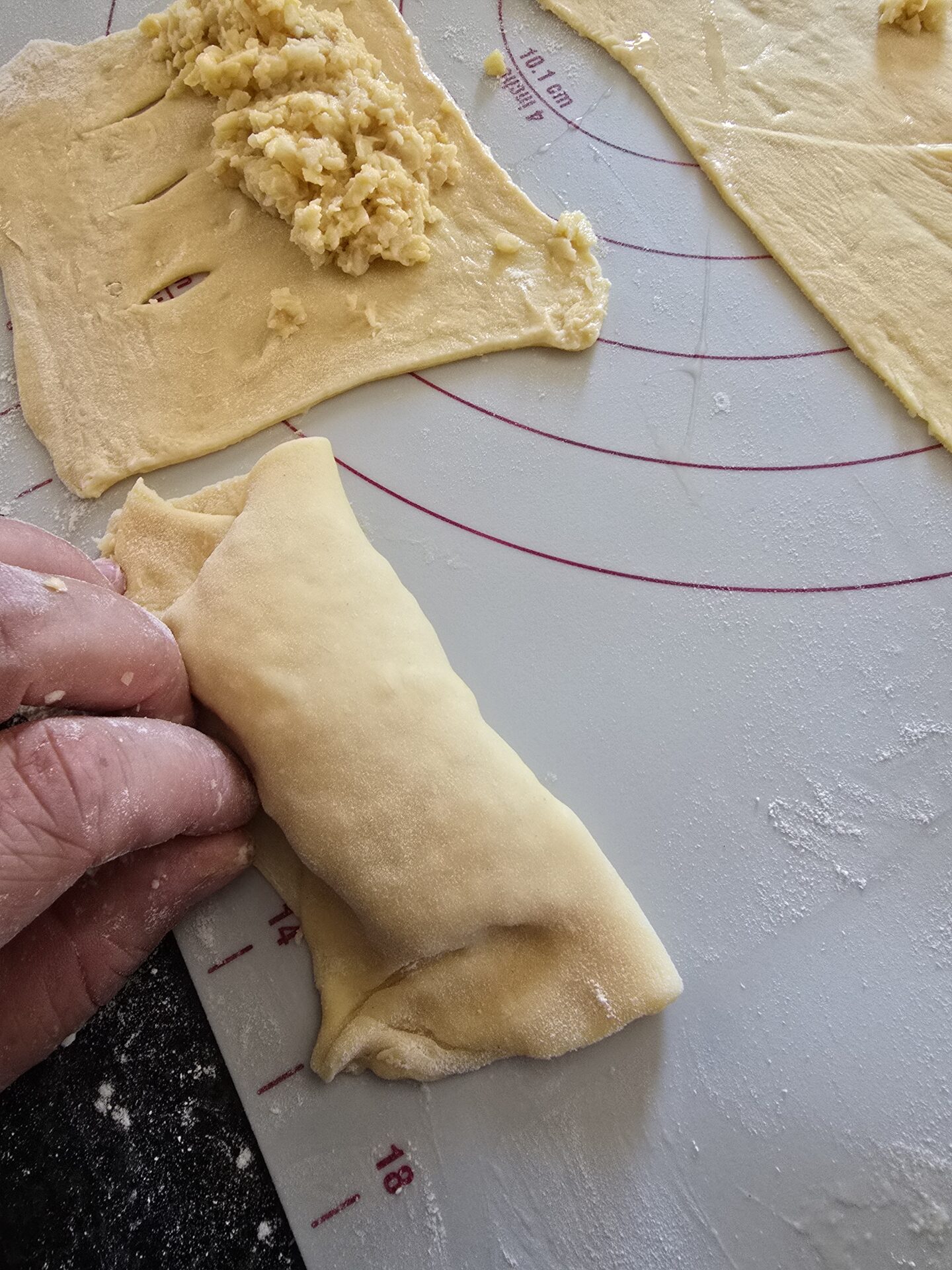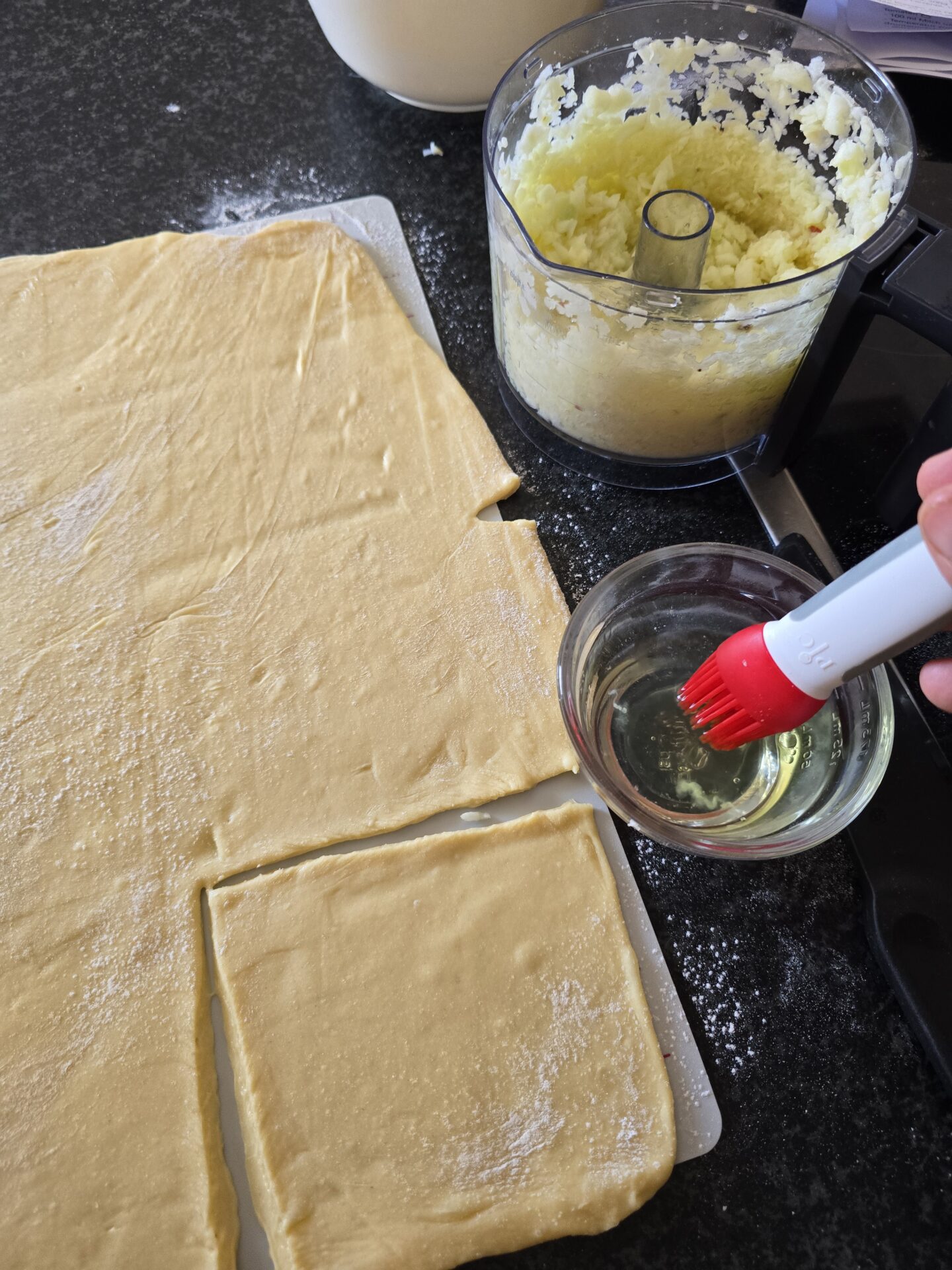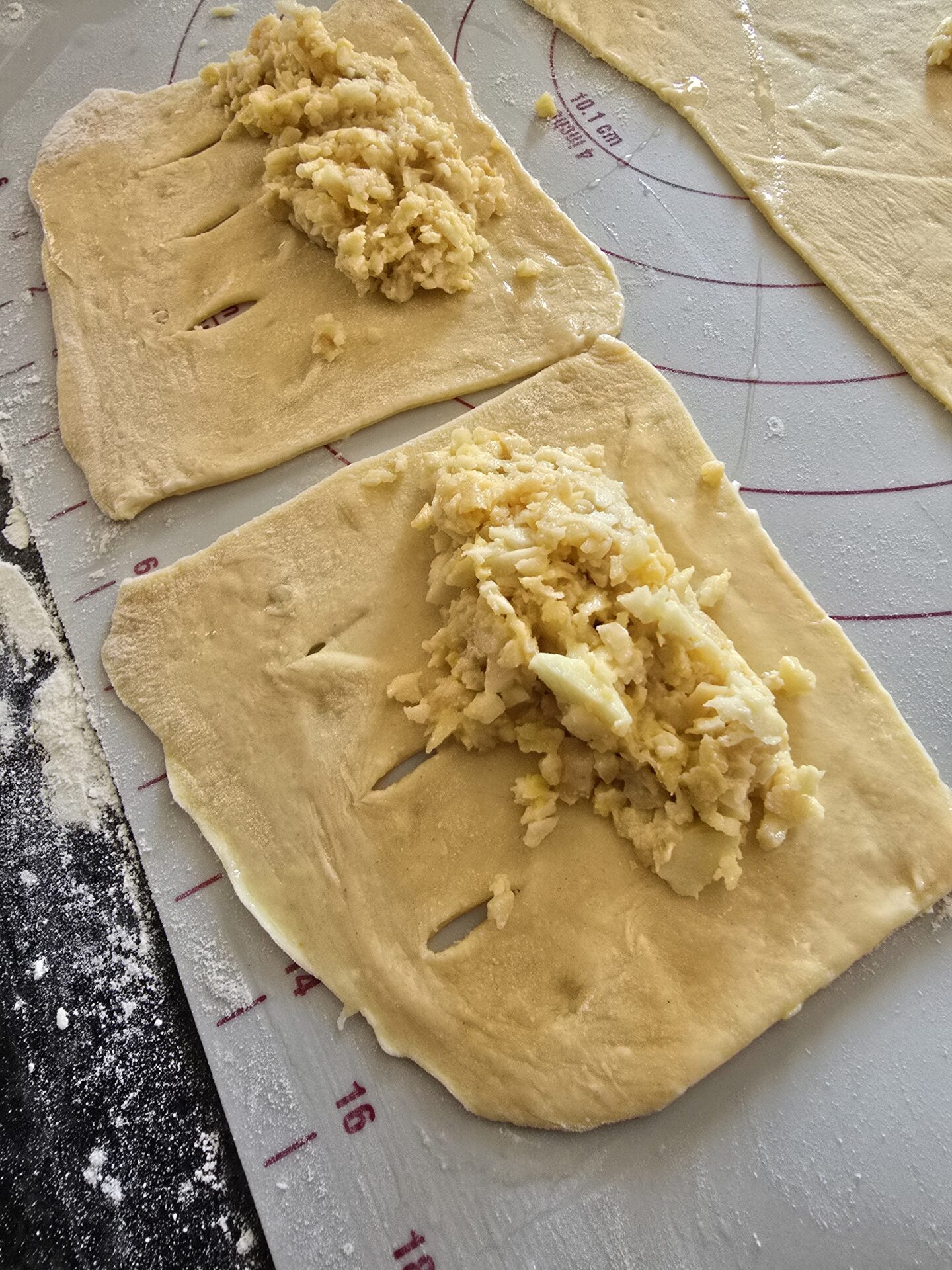 aus dem Teig 12*12 cm Stücke ausschneiden,
