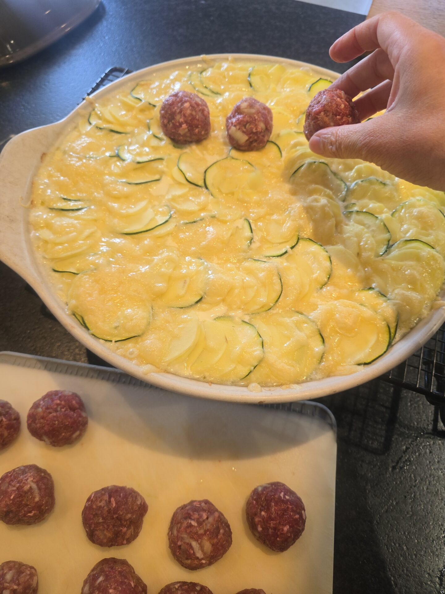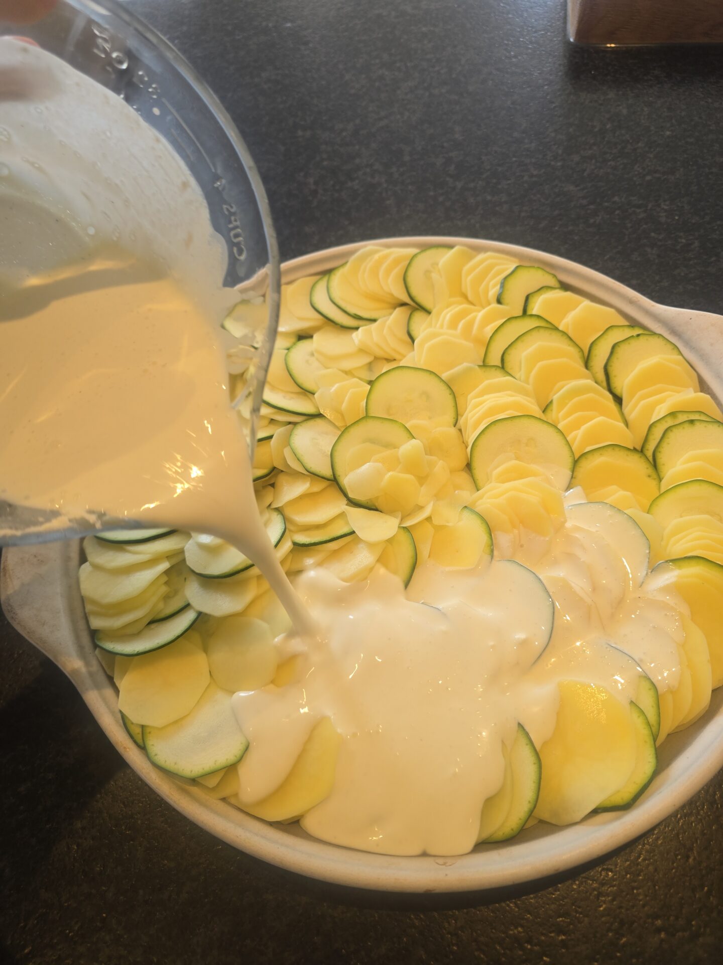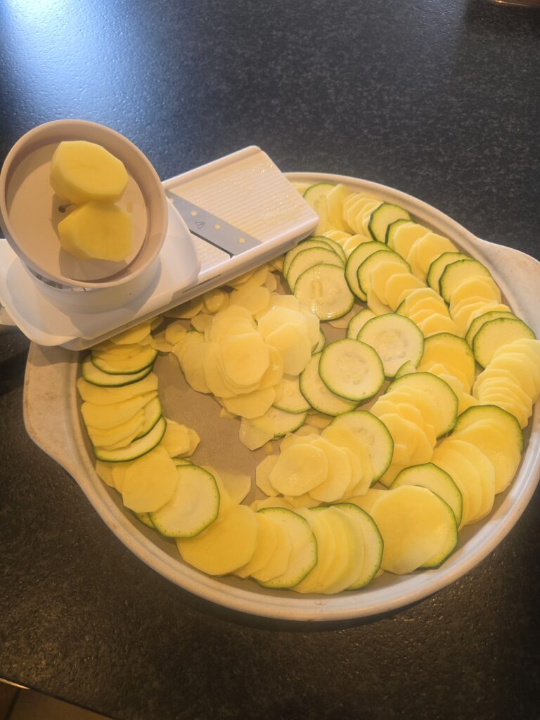 Kartoffeln schälen und mit den Zucchini hobeln