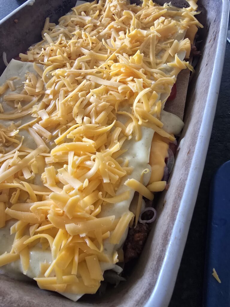 – 1/3 Bolo, Tomaten, Zwiebeln, Gurken 4 Scheiben Schablettenkäse – 4 Lasagneblätter