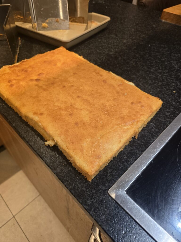 Abgekühlten Tortenboden mittig durchschneiden und mit Eierlikör tränken