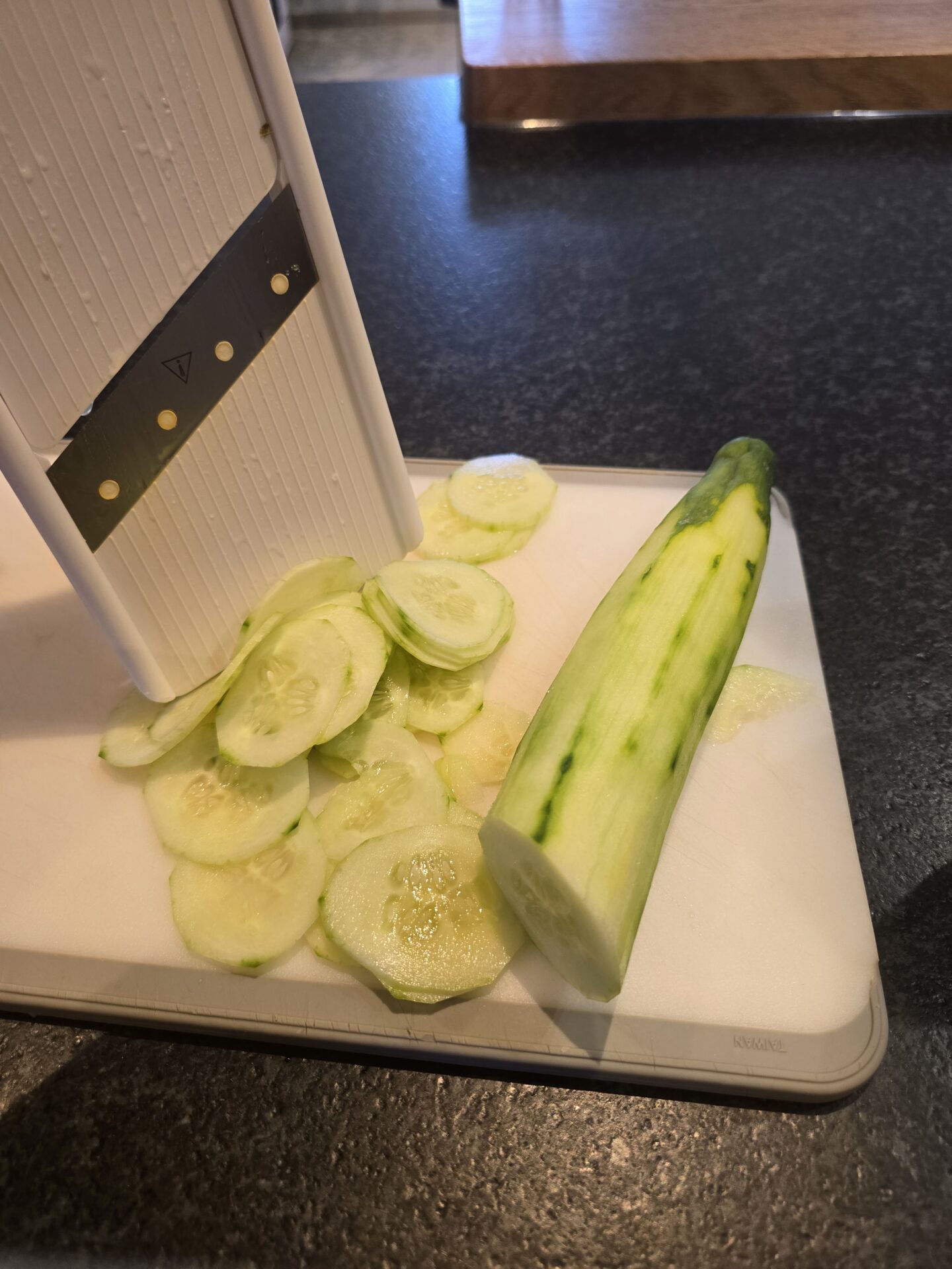 Gurken mit dem kleinen Küchenhobel (Stufe 1) in ein Sieb hobeln