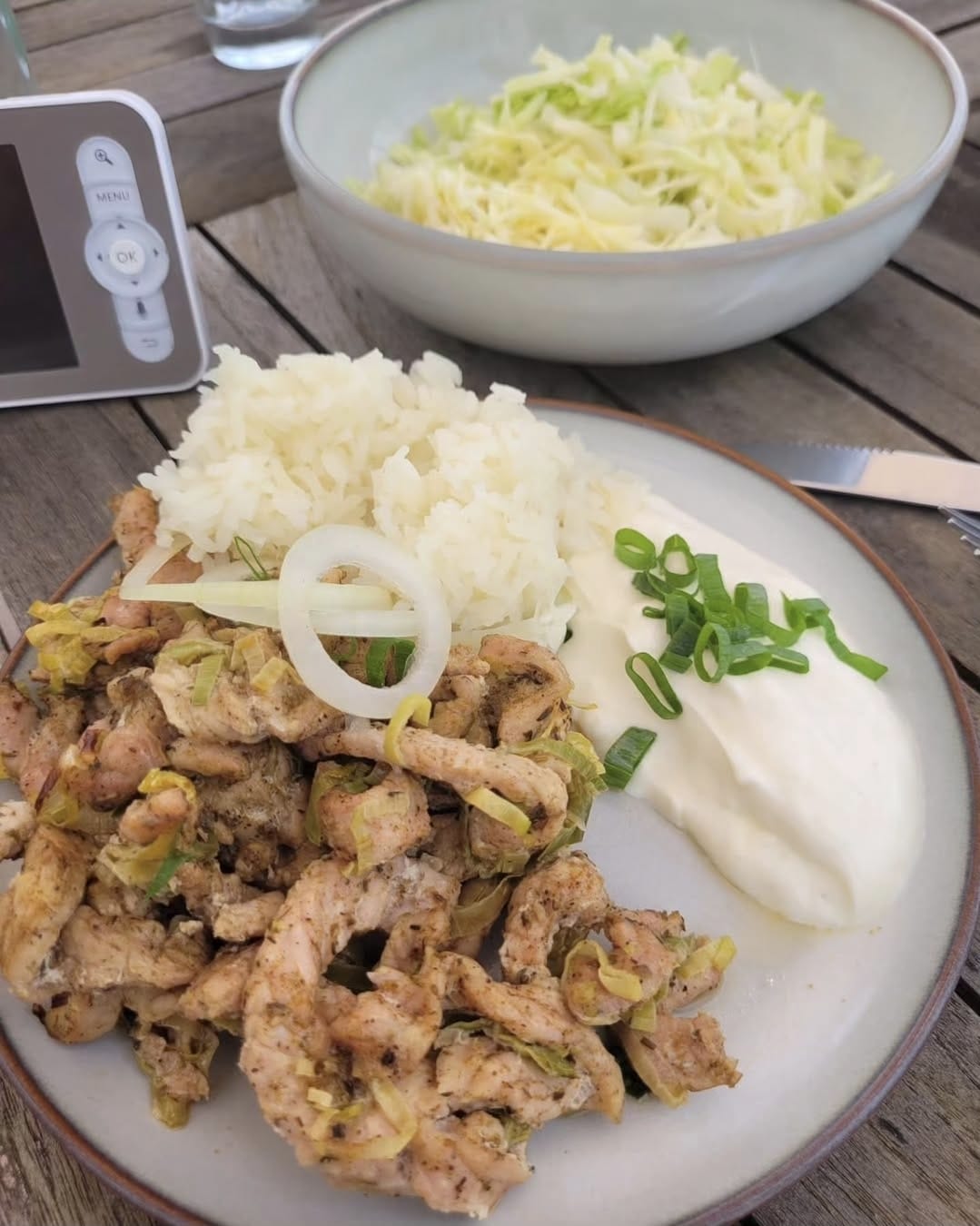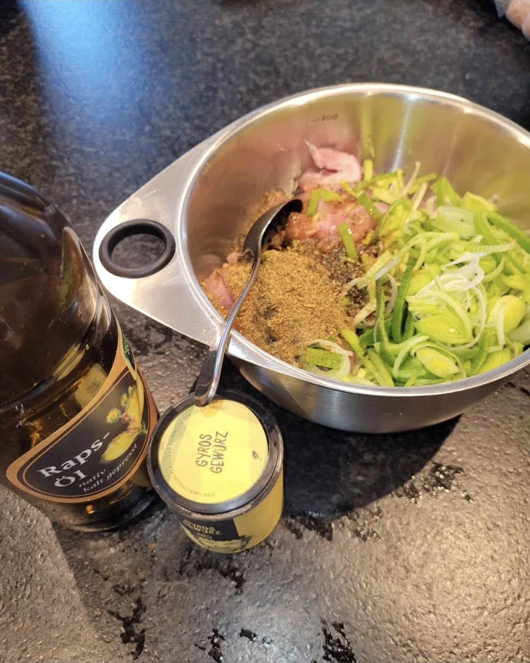 Fleisch mit Lauch, Gewürz und Öl vermischen