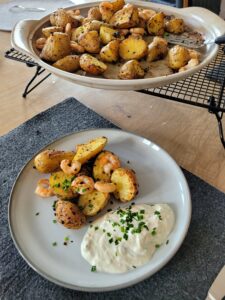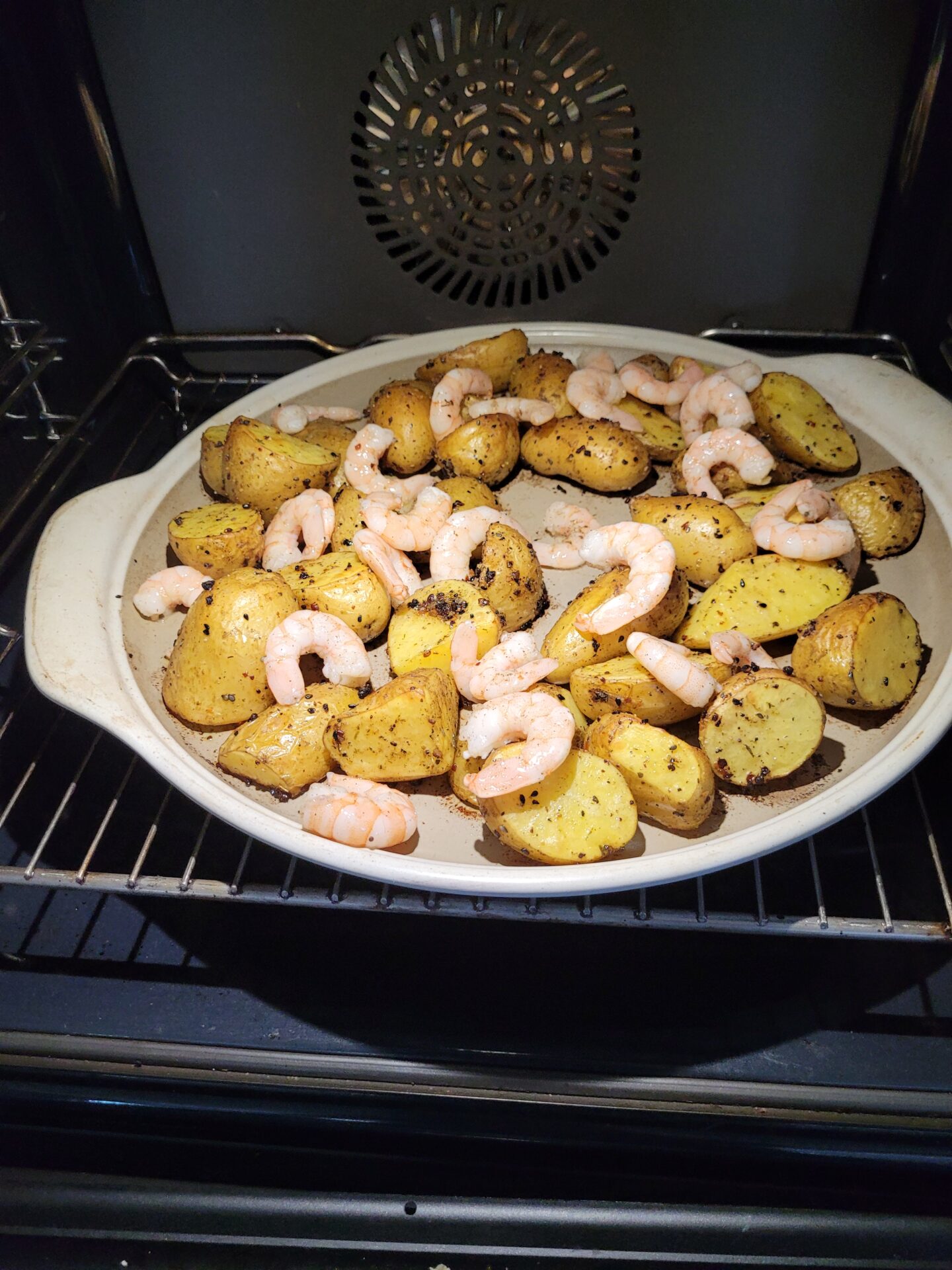 5 Minuten vor Garende die Scampis auf den Kartoffeln verteilen
