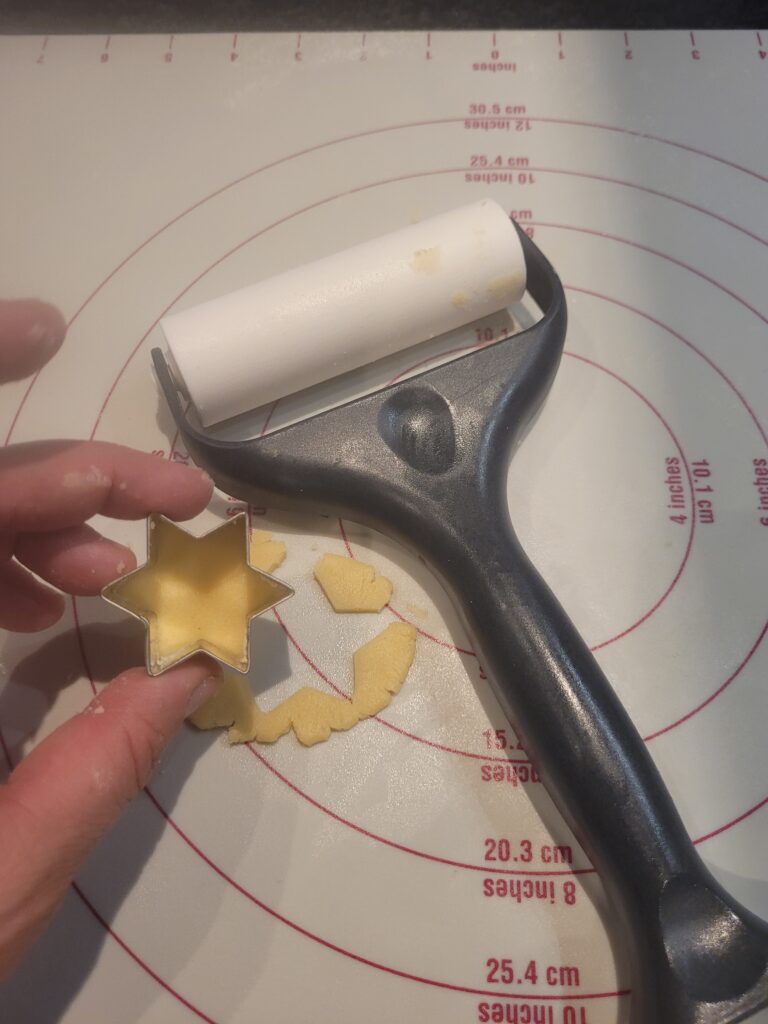 Mehl und Puderzucker auf die Teigunterlage streuen