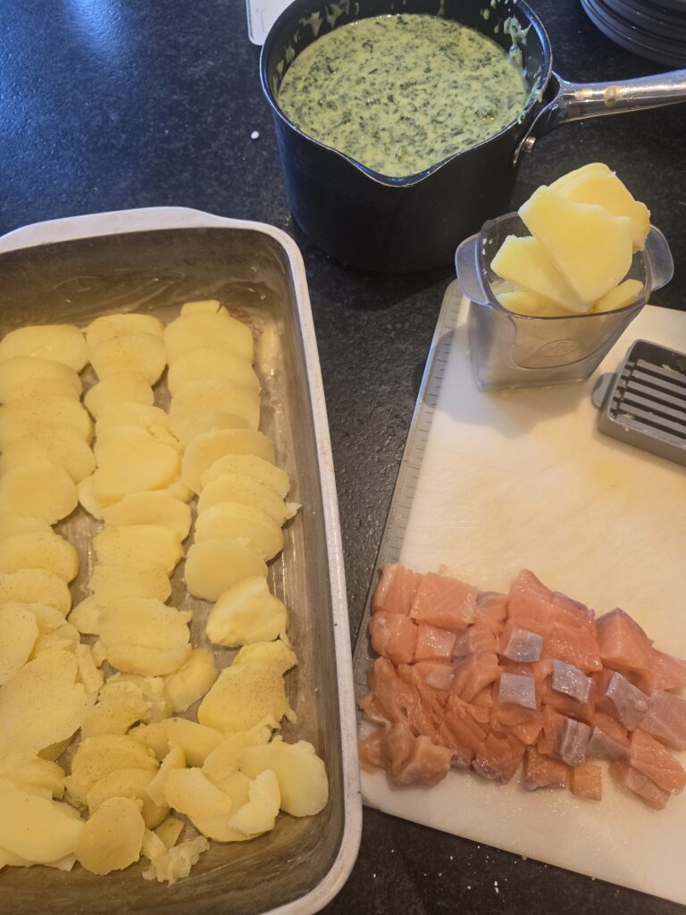 in der Ofenhexe Kartoffeln/ Lachs/ Soße in „2 Runden“ schichten