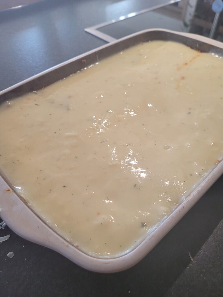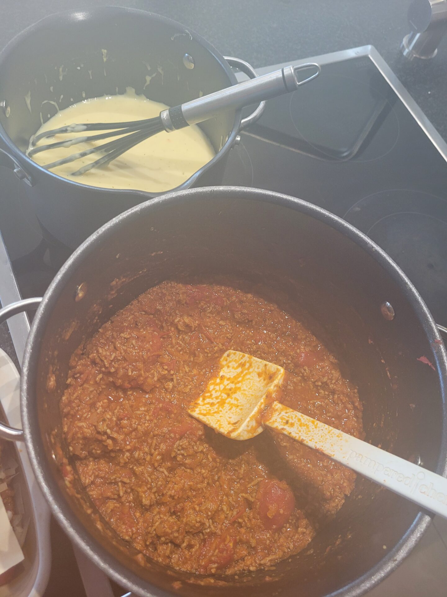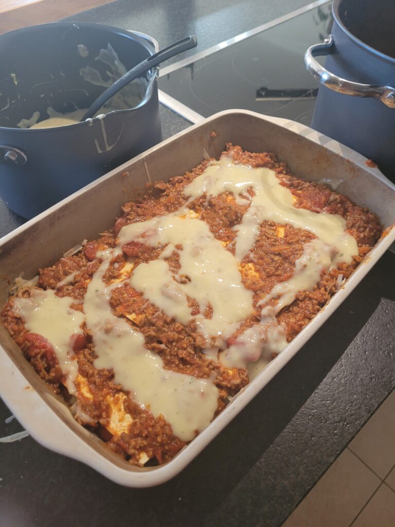 Lasagne schichten Hackfleisch, Soße, Platten und zum Schluss der Käse