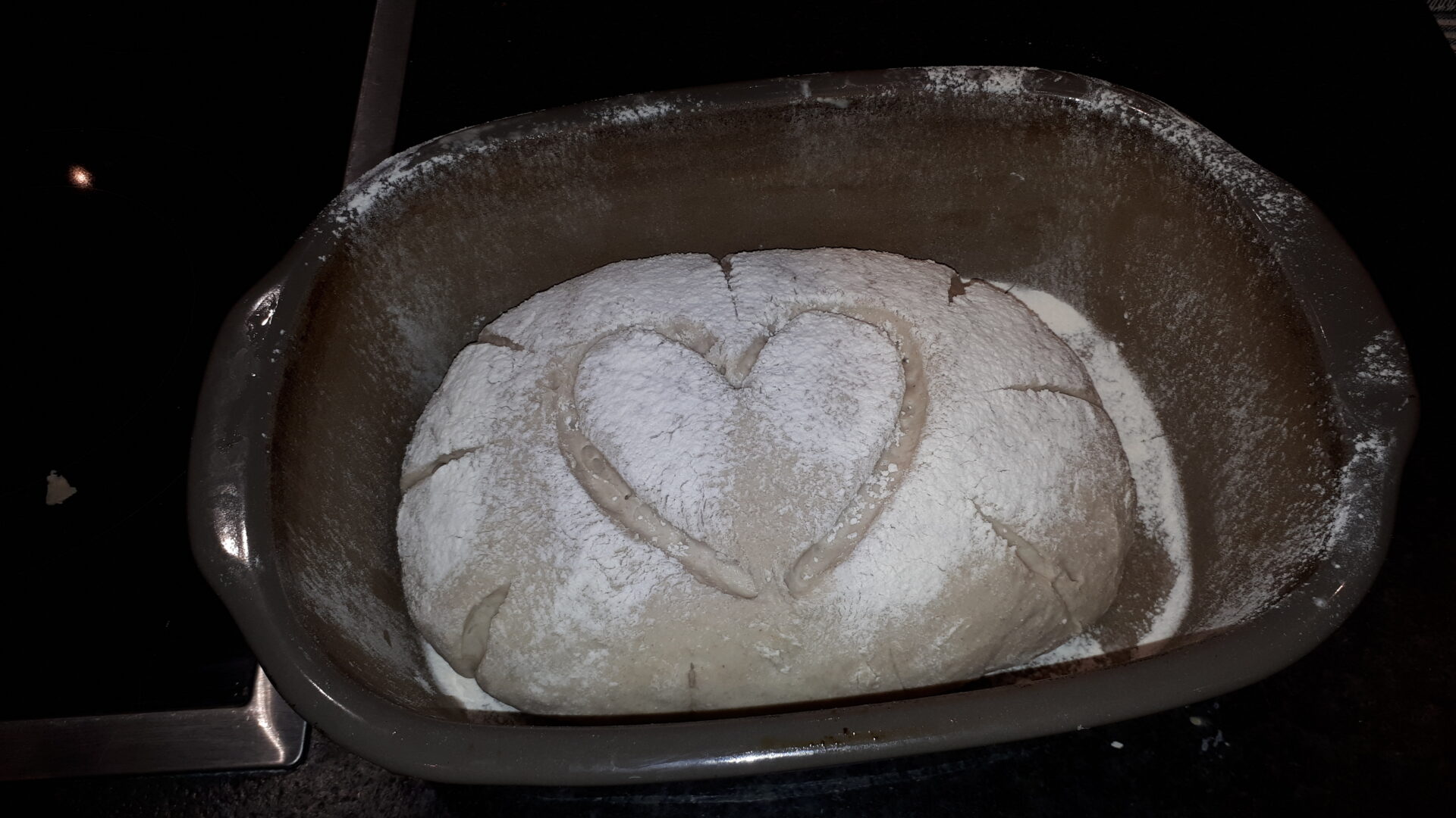 Teig falten und in den bemehlten Ofenmeister legen. Muster einschneiden