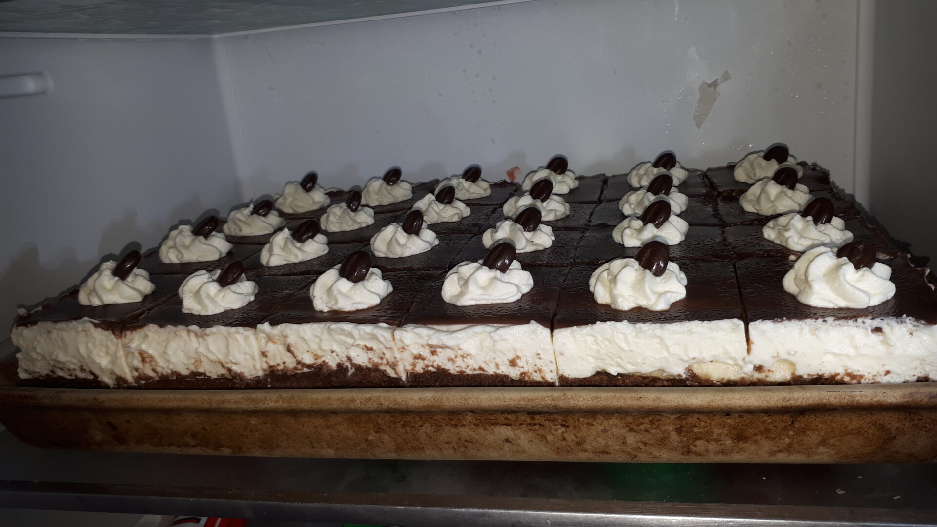 Sahne unterheben, die Masse auf den Kuchen verteilen, min. 30 Minuten kühl stellen