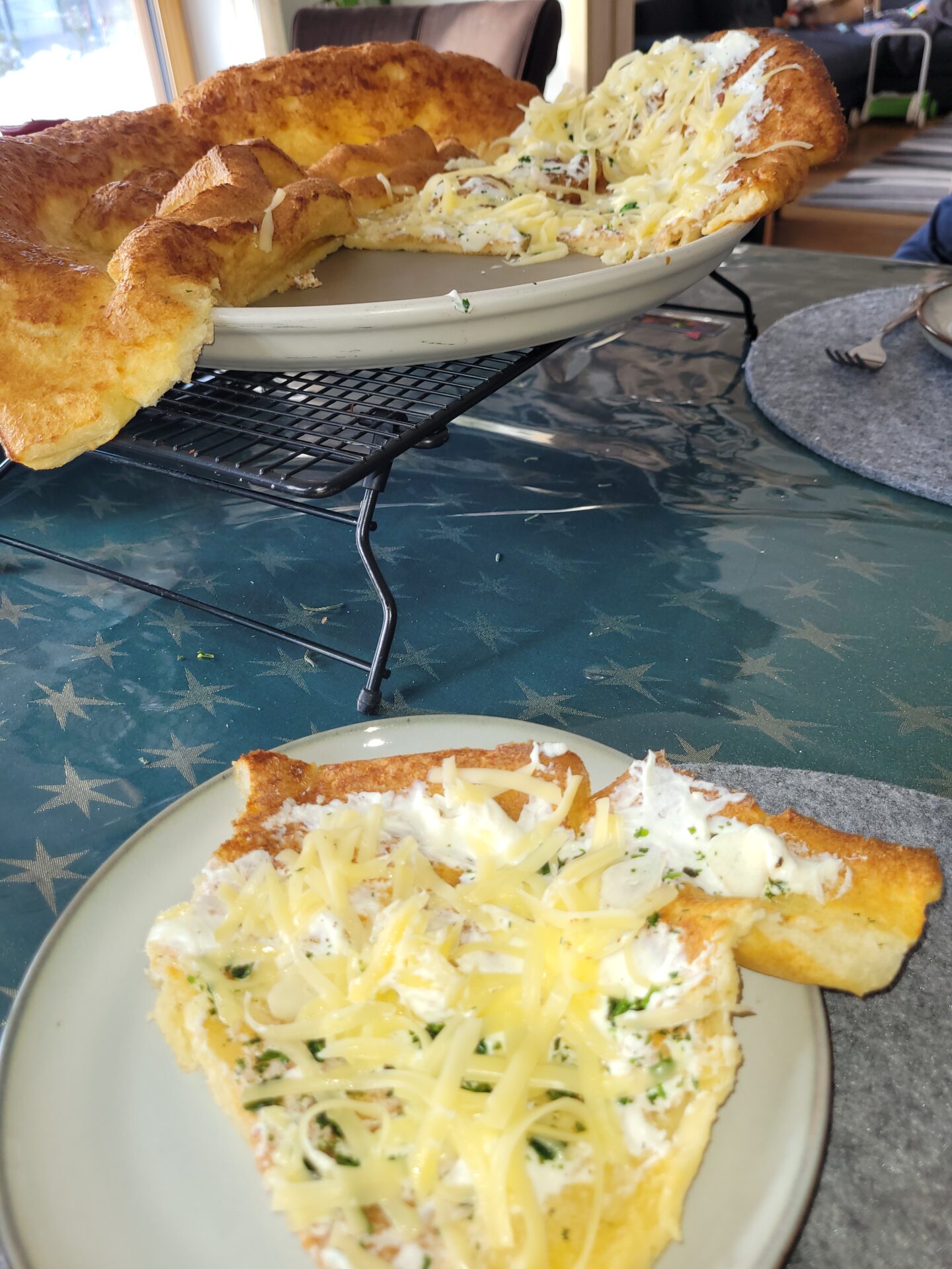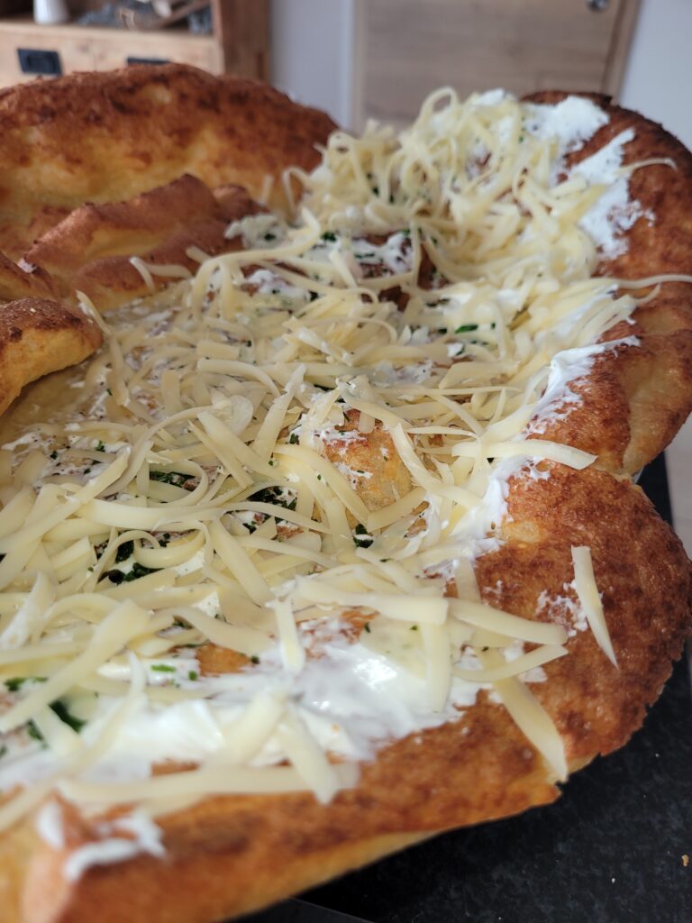 Heißen Ofen-Langosch gleich mit der Creme bestreichen,