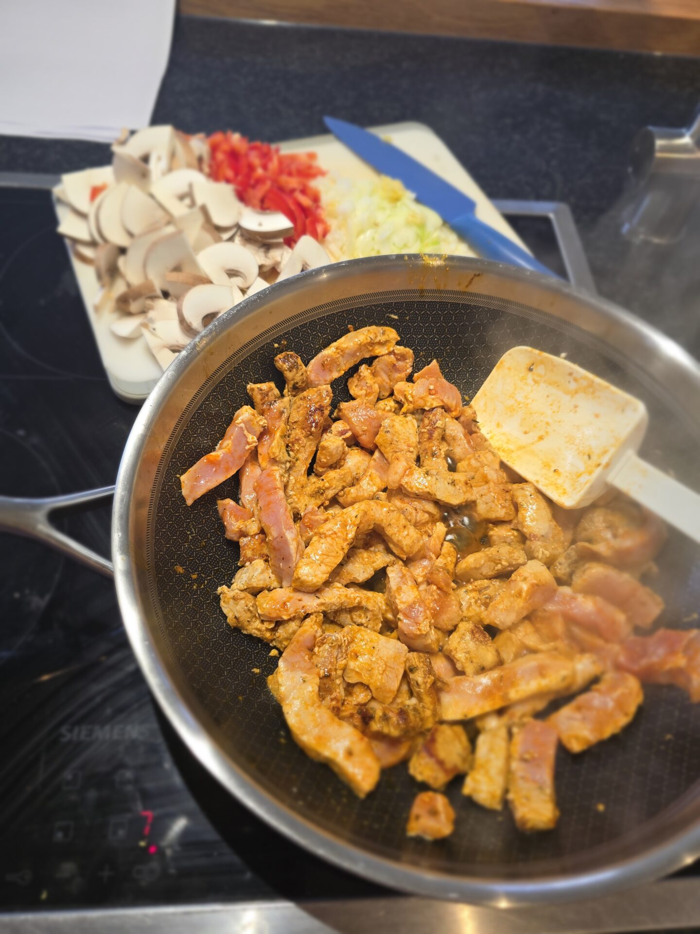 Geschnetzeltes in der Wok Pfanne anbraten, aus der Pfanne nehmen