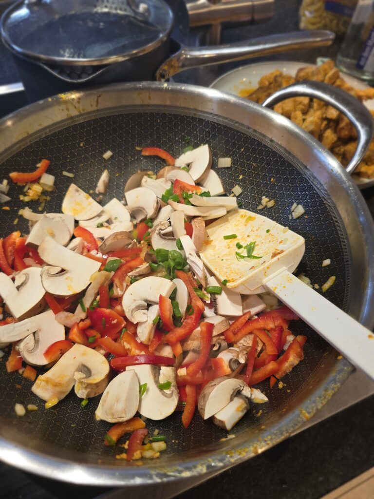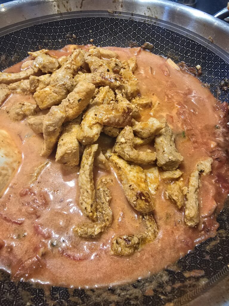 Tomatensoße, Brühe zugeben, 5 Minuten köcheln