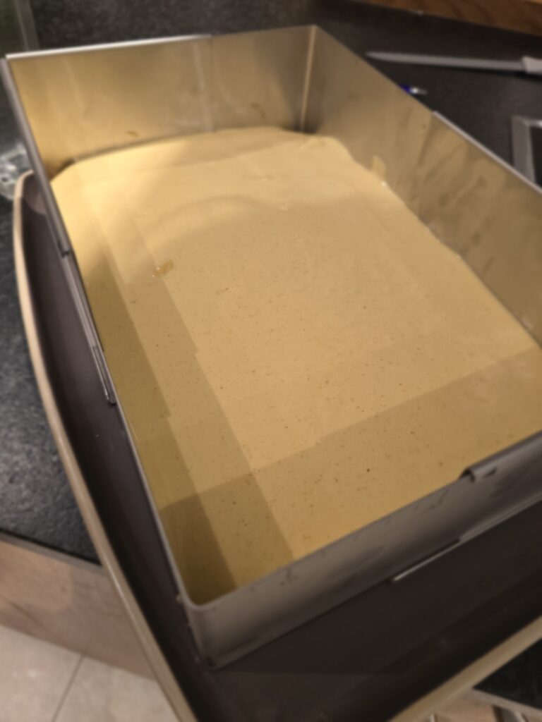 Sahne unterheben, die Masse auf dem Biskuit verteilen