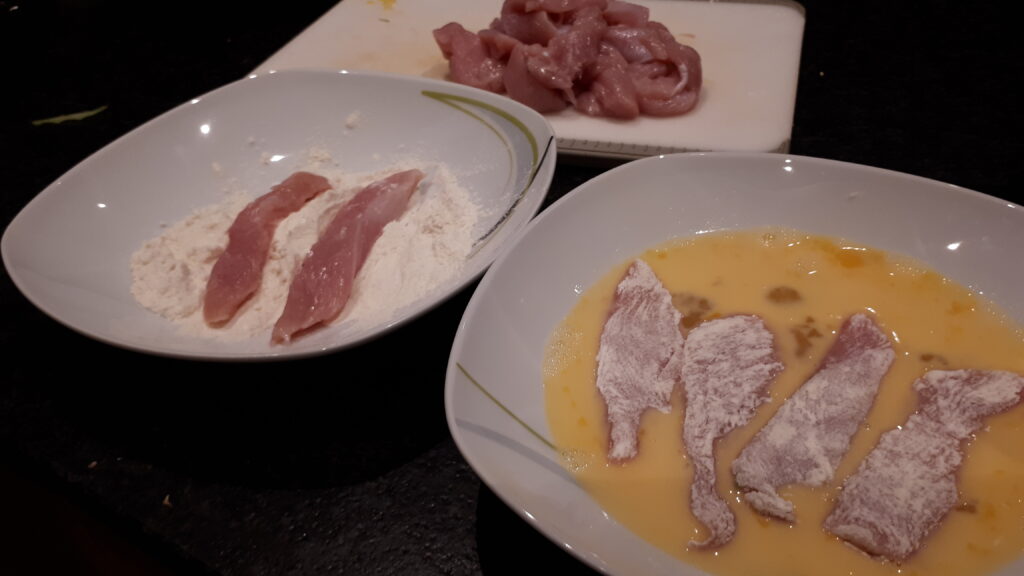 Putenschnitzel panieren: Mehl – Ei – Brösel