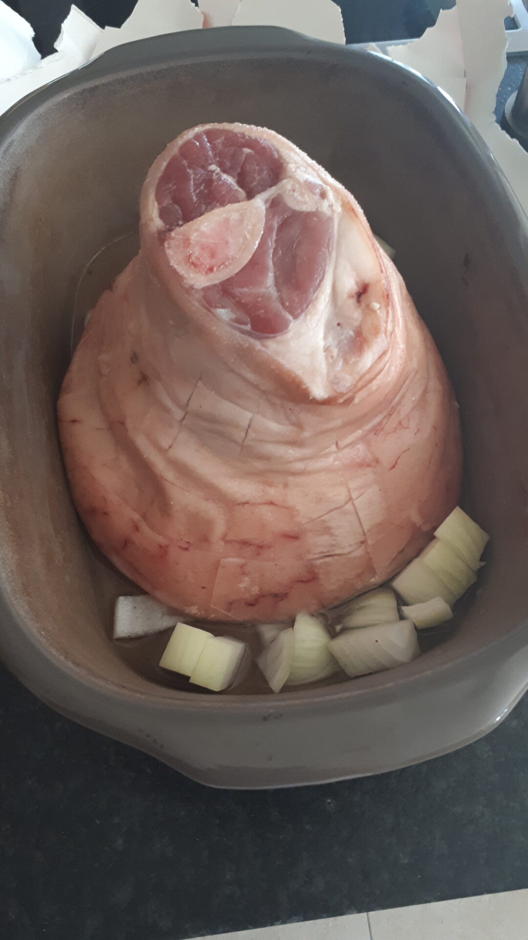Je nach Größe bei O-/U 160 grad ca. 2 Stunden garen (große Hax)
