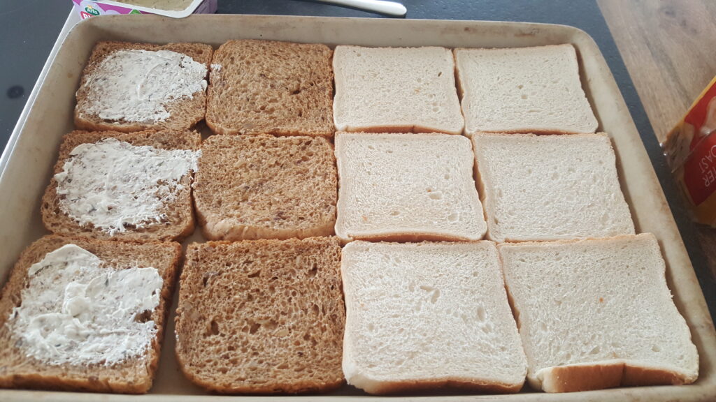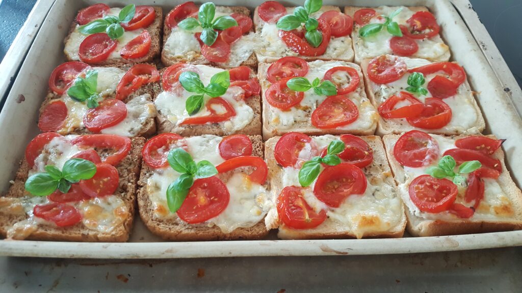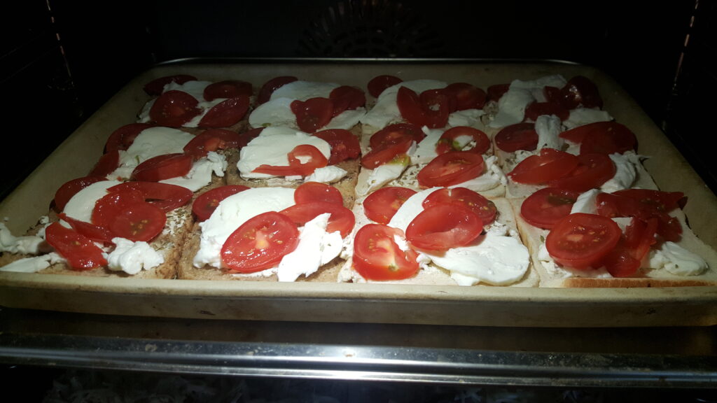Tomaten und Mozzarella schneiden, auf die Toasts verteilen