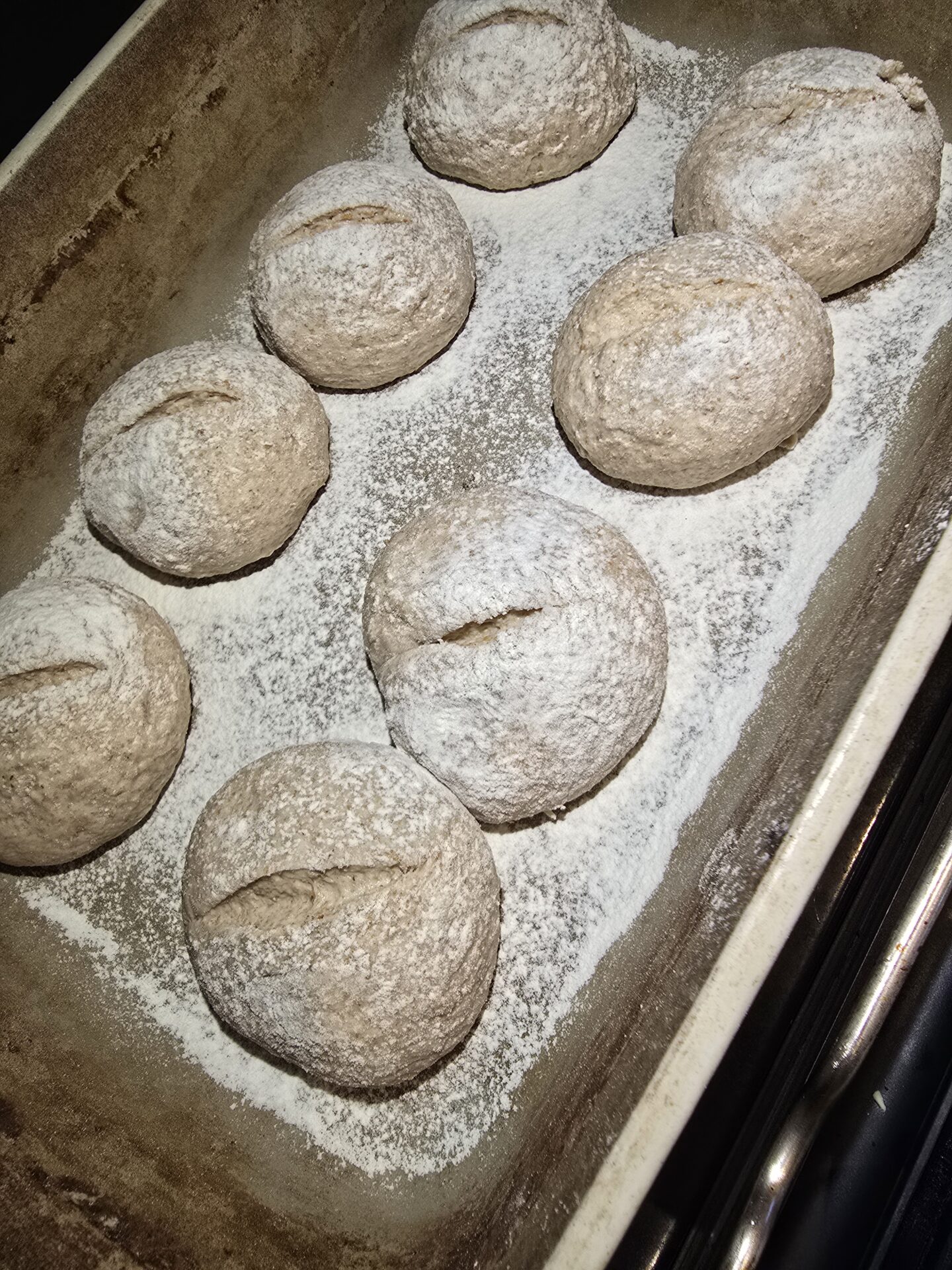 Semmeln in die bemehlte Ofenhexe legen, Deckel drauf
